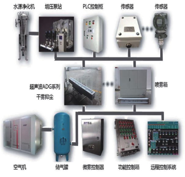 微米級干霧抑塵裝置采用模塊化設計技術(shù)。由微米級干霧機、水氣分配器(或干霧箱控制器)、萬(wàn)向節總成(或干霧箱總成)、螺桿式空氣壓縮機、水氣連接管線(xiàn)和自動(dòng)控制系統、電伴熱系統和自動(dòng)控制系統等組成。