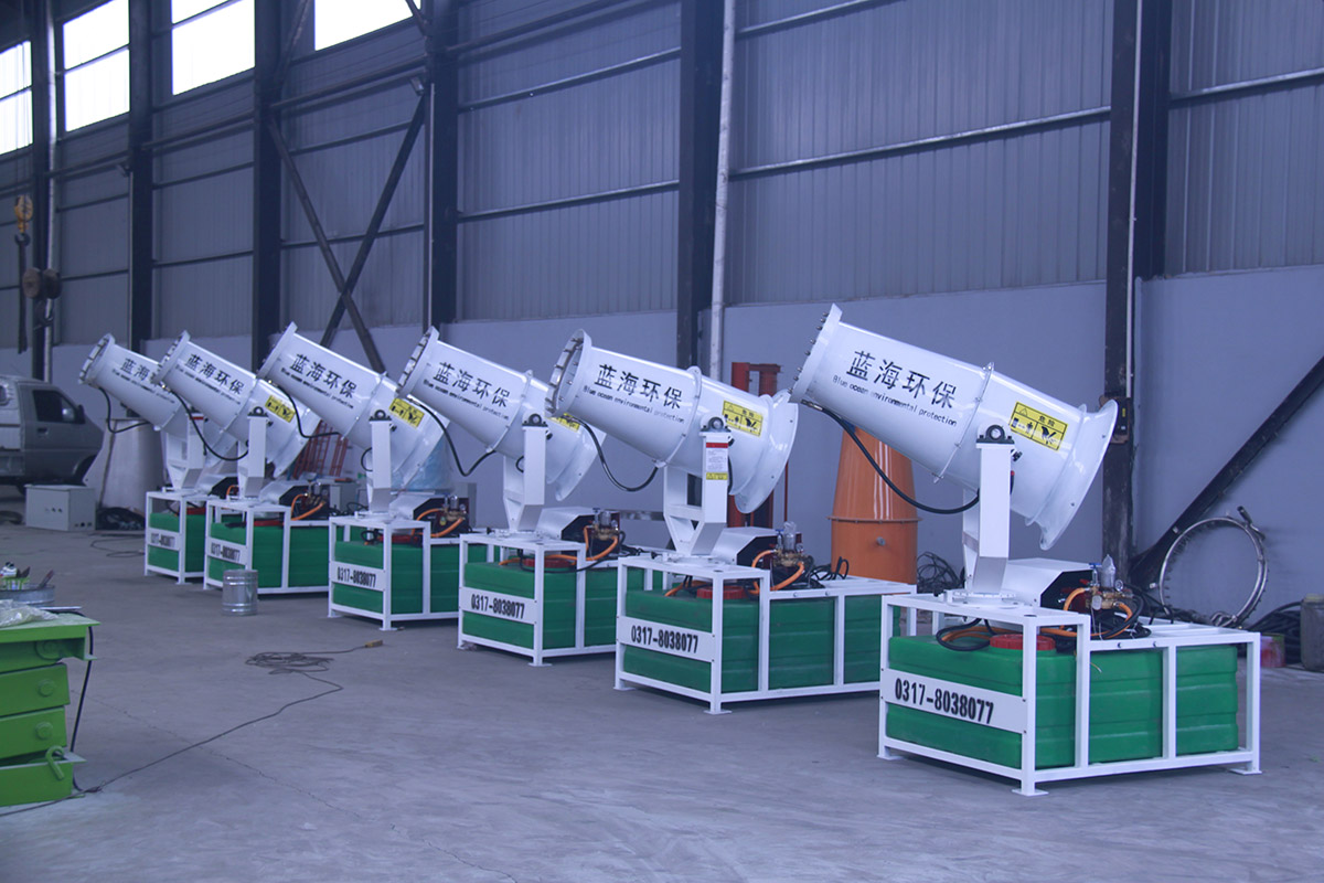 霧炮機應該是用高壓安裝將水霧化工作,使水霧和粉塵顆粒相同大小的水分子,然后應用大功率風(fēng)機送風(fēng),噴霧器具有強風(fēng),范圍廣,防塵空氣與水霧顆粒接觸凝結沉淀,然后到達防止灰塵,凈化空氣。