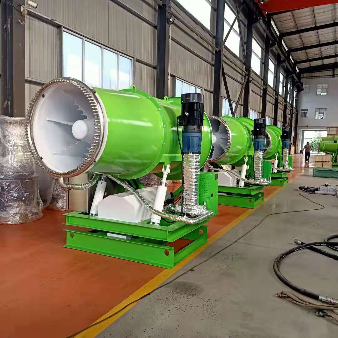 高射程噴霧器根據風(fēng)送原理,先用高壓水泵,將水通過(guò)霧化噴嘴進(jìn)行霧化,在利用風(fēng)機和風(fēng)壓將霧化的水霧噴灑到較遠的距離,讓水霧在達到較遠距離的同時(shí)能夠覆蓋 多的面積,等水霧和粉塵凝結后,達到降塵的目的