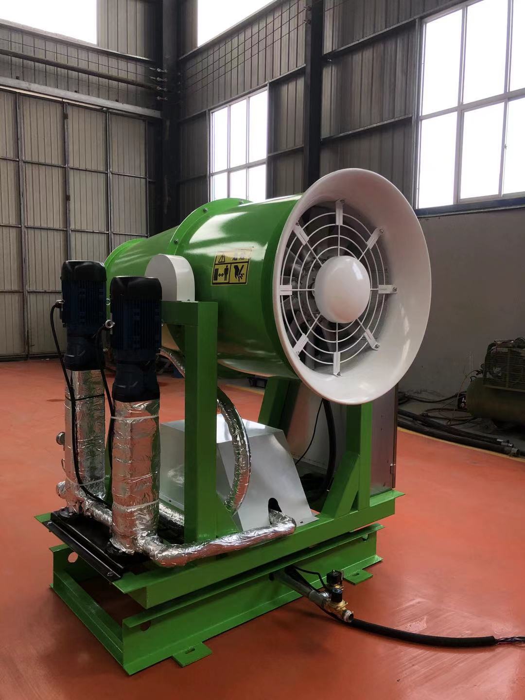 風(fēng)送式霧炮機能有 效控制粉塵,降低粉塵濃度,改 善工作環(huán)境預 防工礦事故,對促 進(jìn)安 全生產(chǎn),保障職工身體健康,維護環(huán)境衛生等具有重要作用。風(fēng)送式霧炮機是有葉輪、風(fēng)筒、后導流器、噴霧裝置以及支架等部分組成的,采用了新型葉輪,高性能后導流器和新型電機支持結構,風(fēng)機效率比較高,成霧也很穩定,霧量調節范圍比較大,霧滴直徑 均勻,操作簡(jiǎn)單方便,使用壽命較長(cháng)。采用國 際 的噴霧重力降塵技術(shù),通過(guò)高壓將水霧化成與粉塵大小相當的顆粒,在風(fēng)機作用下,將水霧拋射到遠方,在塵源處的上方或周邊進(jìn)行噴霧覆蓋。塵埃顆粒與水珠顆粒產(chǎn)生接觸而變得濕潤,被濕潤的粉塵顆粒繼續吸附其它粉塵顆粒,逐漸凝結成顆粒團,并在自身的重力作用下而沉降,雙而達到快速將粉塵抑制降沉的目的。該機是我廠(chǎng) 設計,吸取國內外 技術(shù),根據 環(huán) 保、除塵、消 毒的需求, 立設計開(kāi)發(fā)的高品質(zhì)、高技術(shù)含量的新產(chǎn)品,是解決PM2.5空氣質(zhì)量超標的新除塵設備。