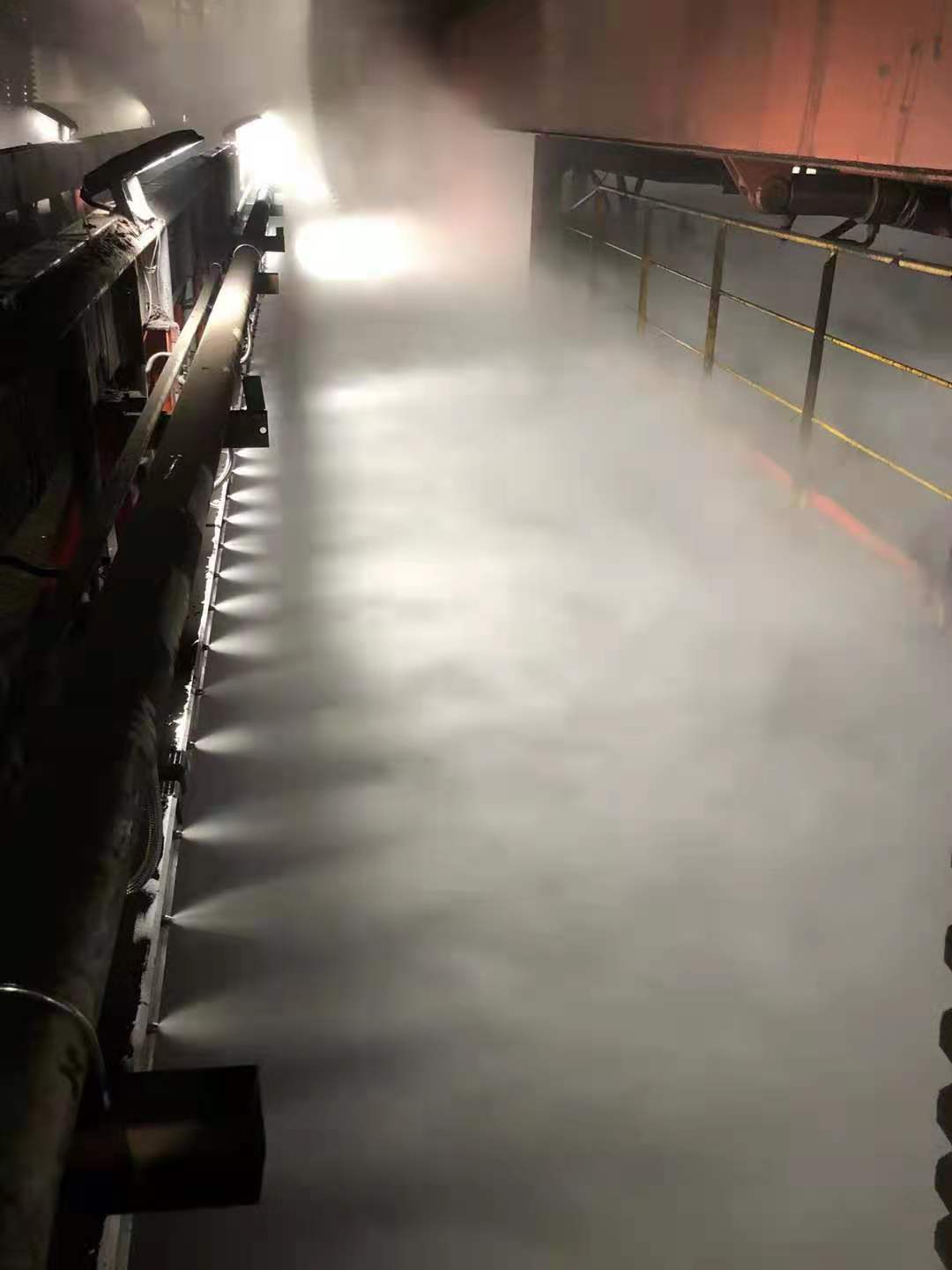 其二由于霧滴微細,部分霧滴會(huì )在空氣中迅速蒸發(fā),使得局部密閉的捕塵空間中空氣的相對濕度很快達到飽和,飽和后的水蒸汽以塵粒為核凝聚形成“云”,并進(jìn)一步增大成為“雨”落下來(lái)。這種機理對抑制亞微米及微米級的粉塵 別有 效。當微米級干霧抑塵裝置工作時(shí),瞬間會(huì )在相對密閉的區域產(chǎn)生大量微細干霧,使得該區域的空氣濕度迅速飽和,飽和后的水蒸汽與粉塵充分的接觸、凝結、沉降,達到抑塵的目的。